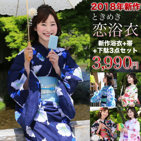 浴衣 セット レトロ 平帯 「なでしこ」ときめき恋浴衣3点セット 浴衣 2018 朝顔 浴衣 レディース 紺 白 モダン 古典柄 クリーム